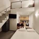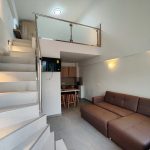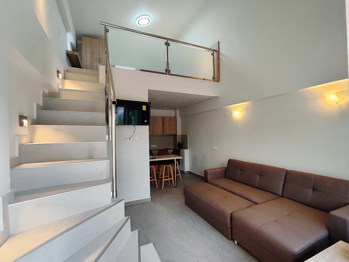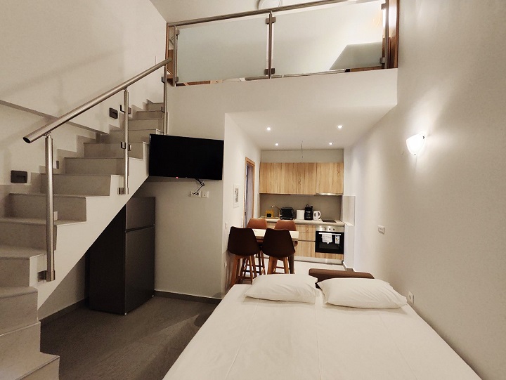 Studiourile pe două niveluri cu balcon și vedere la mare sunt amplasate la etajul al doilea. Nivelul inferior include o zonă deschisă cu bucătărie utilată, un living cu canapea extensibilă și o baie modernă. Nivelul superior oferă o zonă de dormit cu un pat king-size. Balconul include o zonă pentru servirea micului dejun în aer liber. Capacitatea fiecărei unități este de patru persoane.
